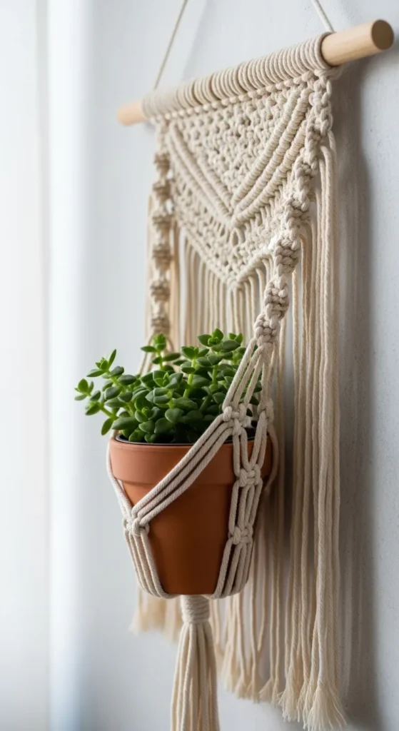 Add greenery with crochet plant hanger wall art. Crochet a small panel with loops to hold mini pots. Mix textures for visual interest. Perfect for kitchens, living rooms, or balconies. Budget tip: small pots and leftover yarn make this a low-cost decorative solution that’s functional and stylish.